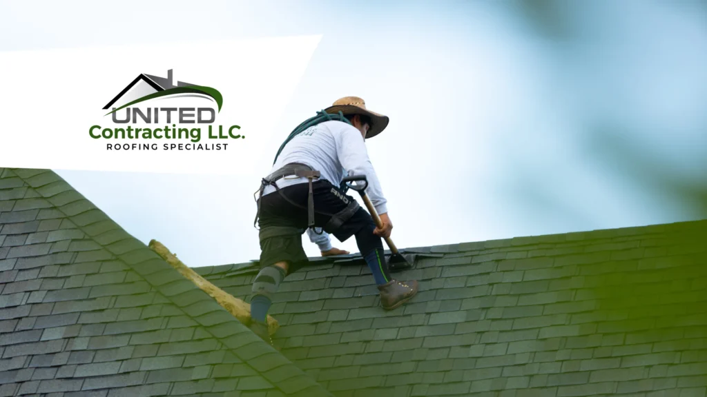 A skilled and professional worker is carrying out a detailed inspection and repair work on a roof. The image highlights the worker's concentration and technique, conveying the quality and reliability of the service offered by United Contracting.